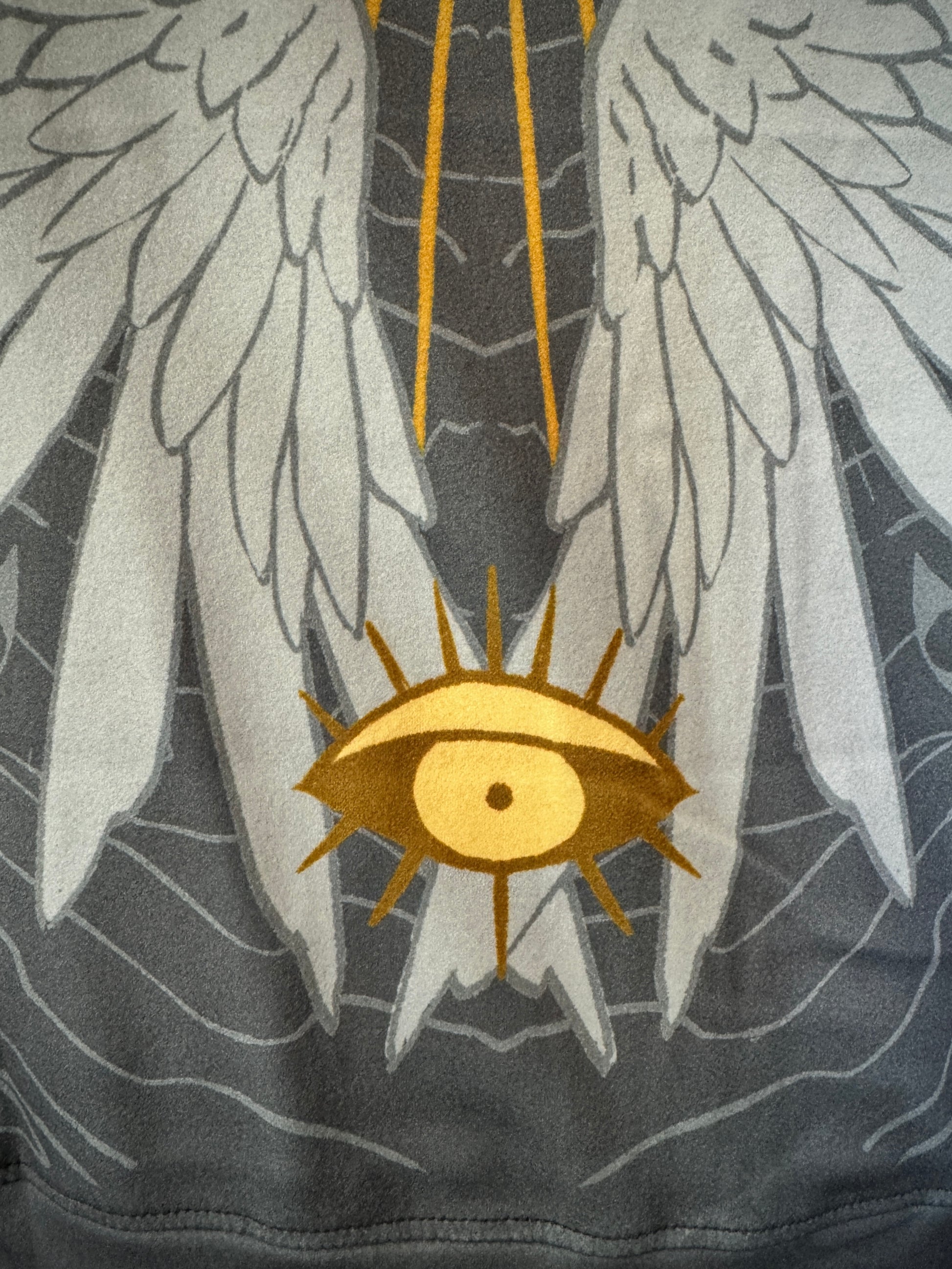 The “Biblically Accurate Angel Jacket” has angel wings and eye designs displayed in soft gray and white accents. This ita jacket combines style and comfort with its intricately embroidered sleeves and soft fleece interior. Personalized to have the appearance of a choir of angels known as “seraphim” this unique ita jacket is sure to captivate the eyes.