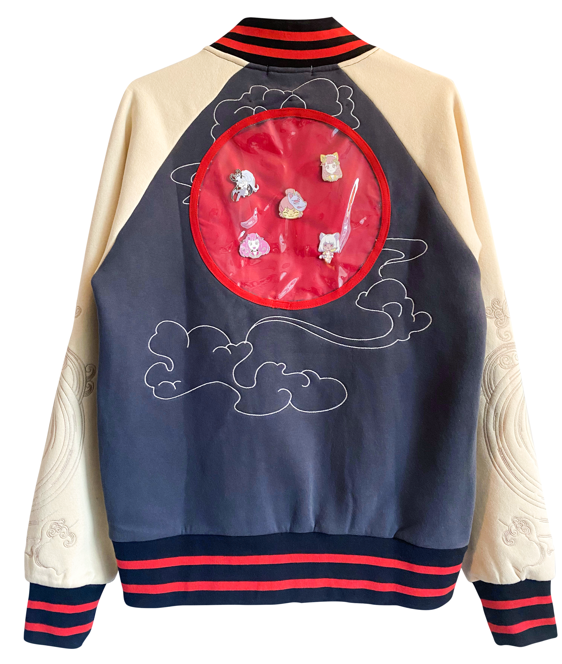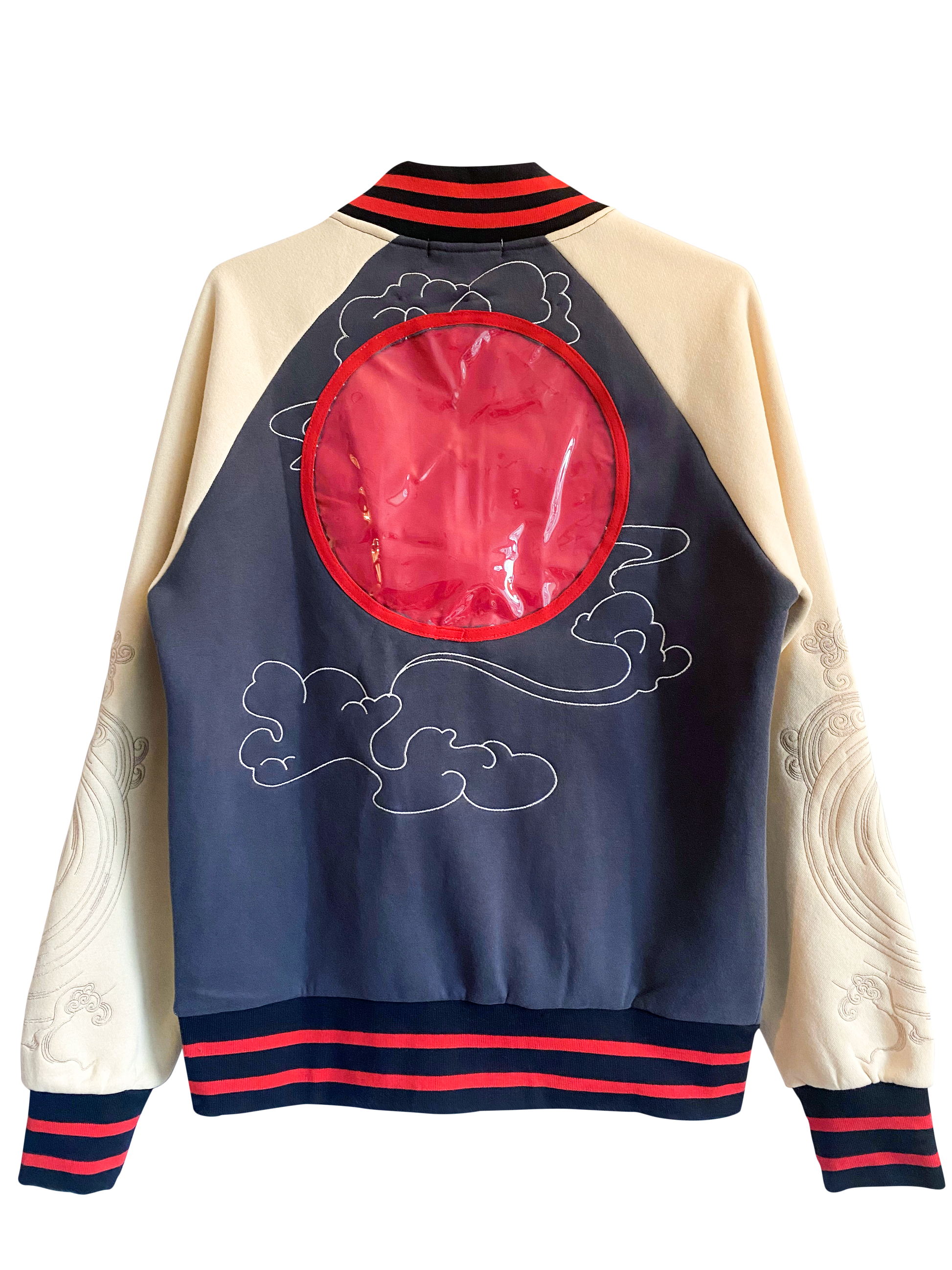 - Hand drawn embroidered sleeves inspired by traditional japanese sukajan