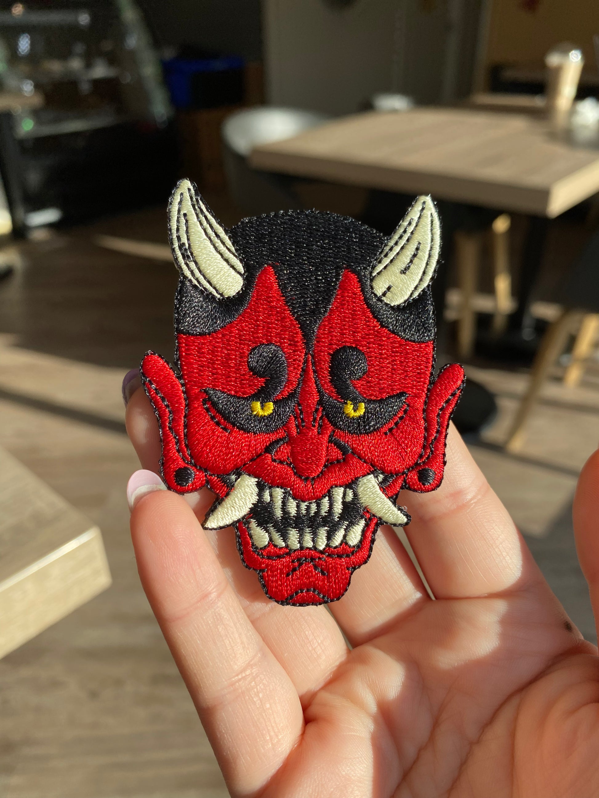 A devilishly stylish oni patch, originally designed for the oni jacket and now available as an individual accessory for you to decorate anywhere you please!