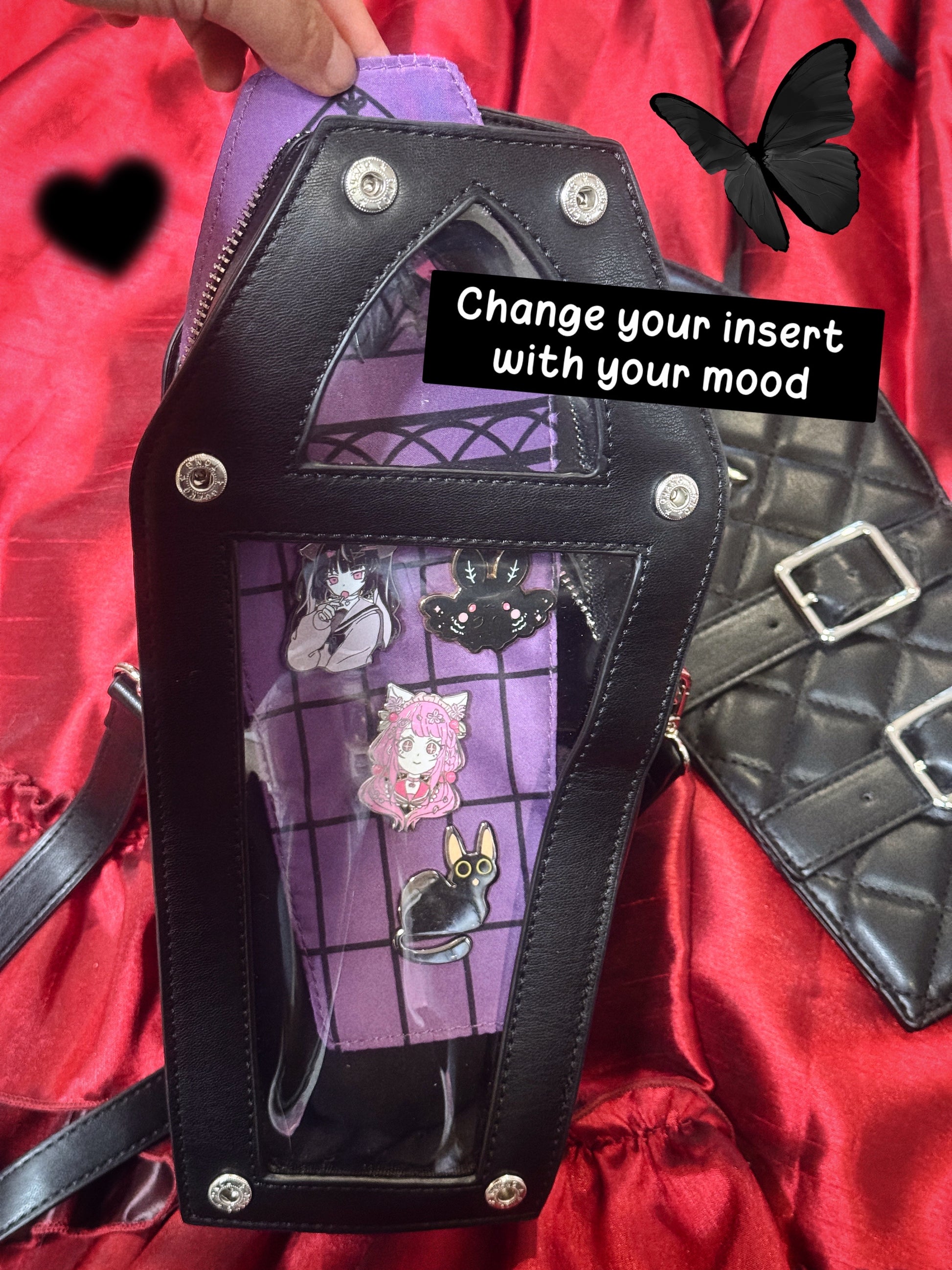 Faux leather coffin ita bag with a removable cover and 2 different inserts to choose from.