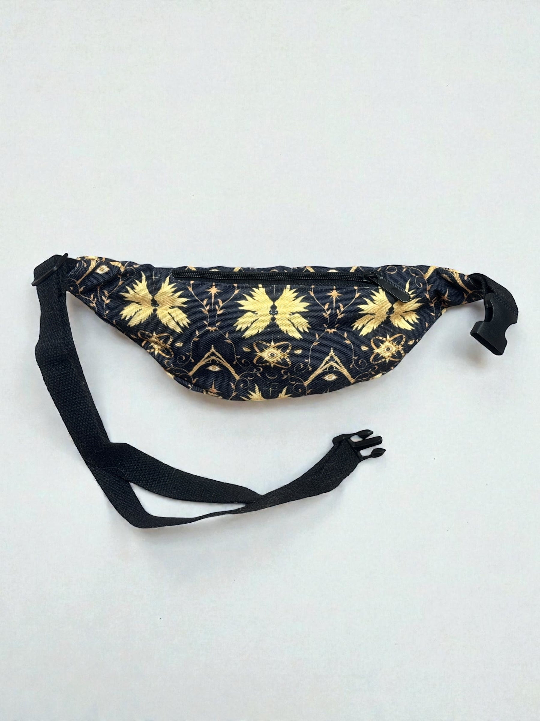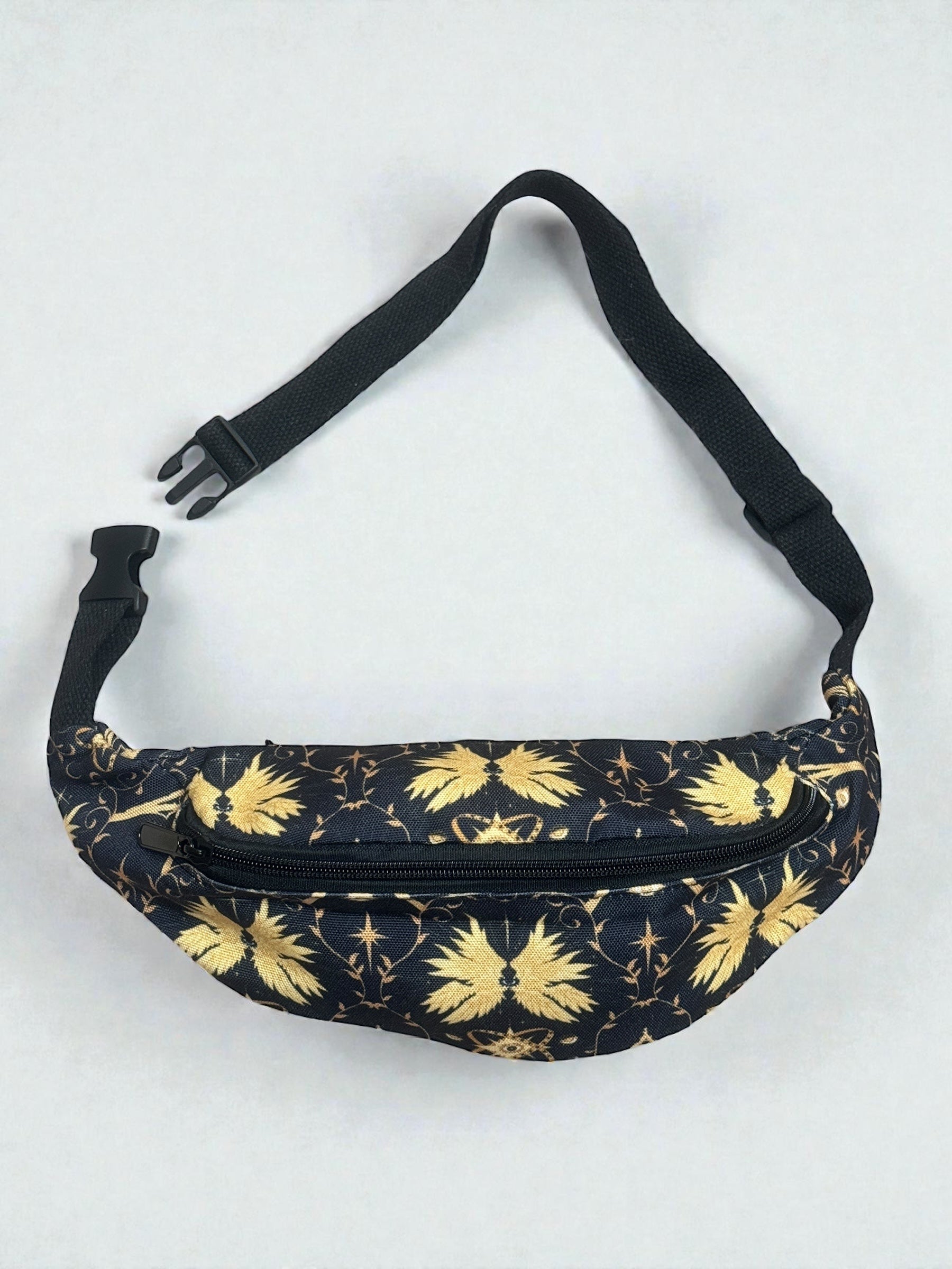 This waist bag features a Biblically Accurate Angel reshaped into a dark, ornamental pattern that feels more ancient relic than Sunday school.